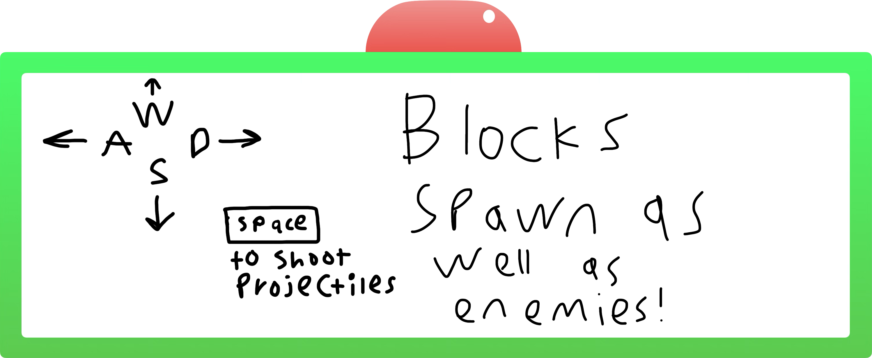 Use the WASD keys to move and press space to shoot projectiles at the purple alien enemies. Projectiles cannot break red boxes. Touch the winged frog to reach to the next level.